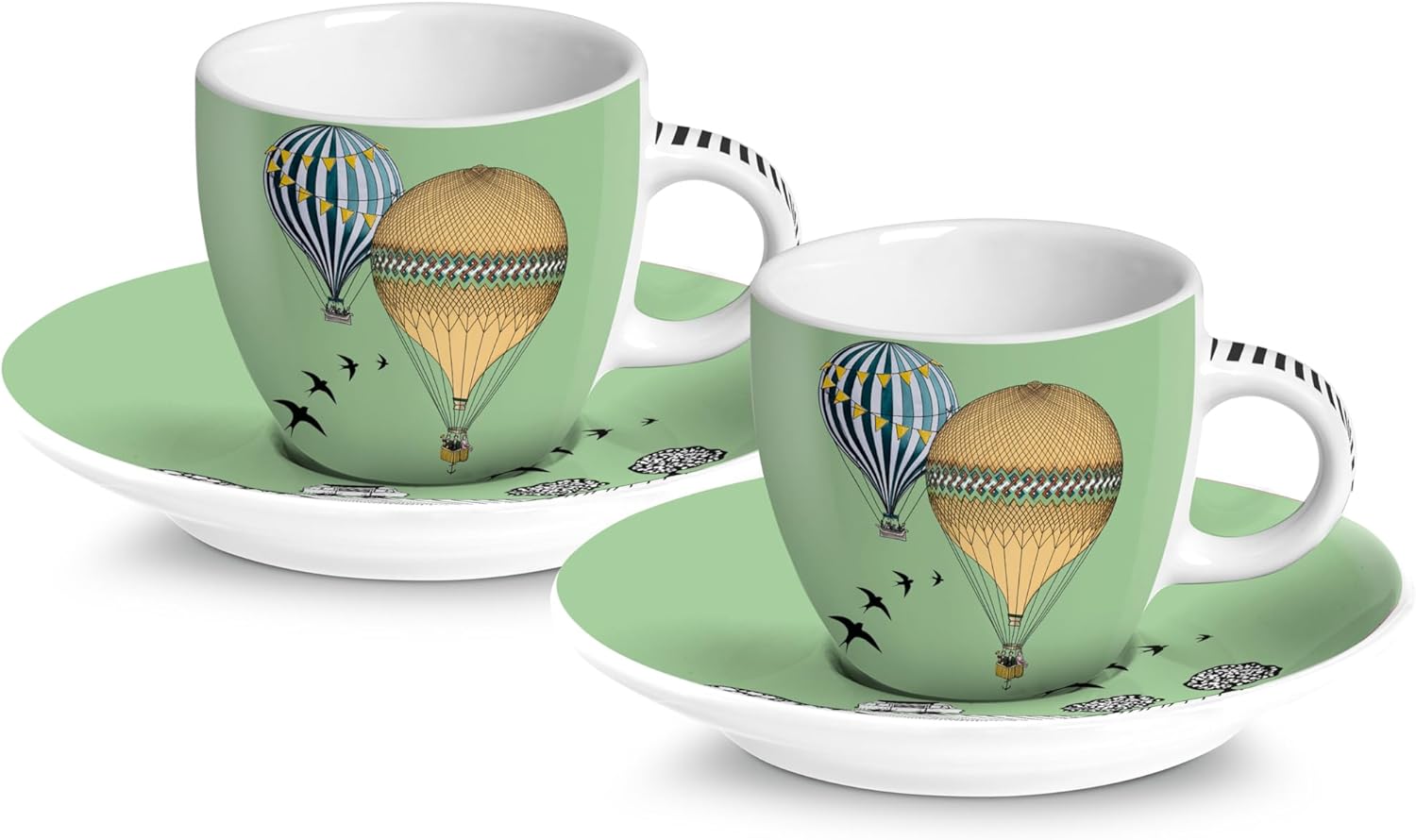 طقم فناجين إسبريسو مع صحون من إيغان جيراموند، قطعتان، 80 مل، طقم فناجين قهوة من البورسلين للإسبريسو والقهوة العربية، تصميم منطاد الهواء الساخن، طقم هدايا (أخضر فاتح)
